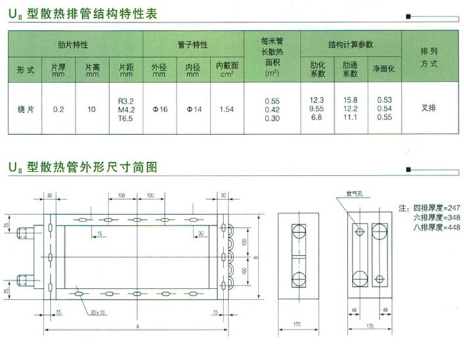 型号-排数(片距代号)--表面管数--表面管长(英寸) 如采用两排,片距为3.2mm,表面管数为21,管长为60英寸,则为UII-2(R)-21-60